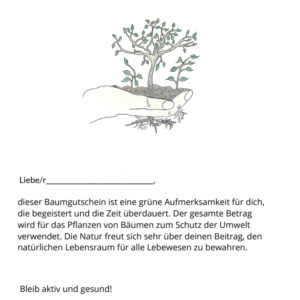 Make your beloved ones a special and sensible gift by donating some trees for them in form of a voucher. The full amount will be used for planting trees which will help the environment to adapt to the challenges of the changing climate.